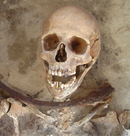 Vediamo allora le caratteristiche di queste sepolture devianti. In quattro casi, il defunto era stato seppellito con una falce di ferro all’altezza della gola: si tratta delle tombe 28/2008 (un maschio adulto), 24/2009 e 49/2012 (due femmine adulte) e 6/2012 (un’adolescente); un’altra tomba (60/2010) è invece relativa ad una donna più anziana, con la falce, questa volta, all’altezza delle pelvi e, sulla gola, invece, una pietra; infine, la tomba 29/2008 è relativa ad un soggetto di 12/15 dal sesso indeterminato con due pietre all’altezza della gola. Si può anche ricordare il fatto che a molti (se non, forse, a tutti) di questi defunti era stata inserita in bocca una moneta di rame: questa era però una pratica comune, documentata in un terzo delle tombe scavate a Drawsko.