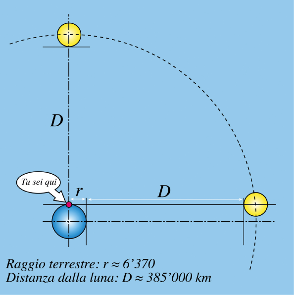 La Luna, distante dalla Terra di approssimativamente 385.000 km, mantiene sempre la stessa grandezza angolare[1] nel nostro cielo notturno, ossia circa un mezzo grado (per essere più precisi: 0,52°, che, stranamente, è la stessa grandezza angolare del Sole). L'impressione comune di vedere la Luna di dimensioni maggiori quando è vicina all’orizzonte viene paradossalmente contraddetta dalla matematica. La distanza luna-osservatore varia lungo il suo percorso celeste, può diminuire di un valore pari a un raggio terrestre quando raggiunge lo zenit, come dimostrato in Fig. 1 (anche se l’orbita lunare è ellittica!). Quindi, la Luna sarebbe fisicamente più lontana quando sorge o tramonta e apparirebbe all’incirca 1,5% più piccola, però tale cambiamento non può essere percepito a occhio nudo.
