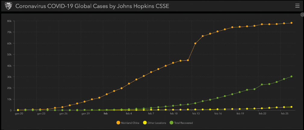 Un primo passo per visualizzare l’evoluzione di un’epidemia è riportare i dati su un grafico. Probabilmente molti dei lettori avranno visitato il sito web realizzato dalla Johns Hopkins University.