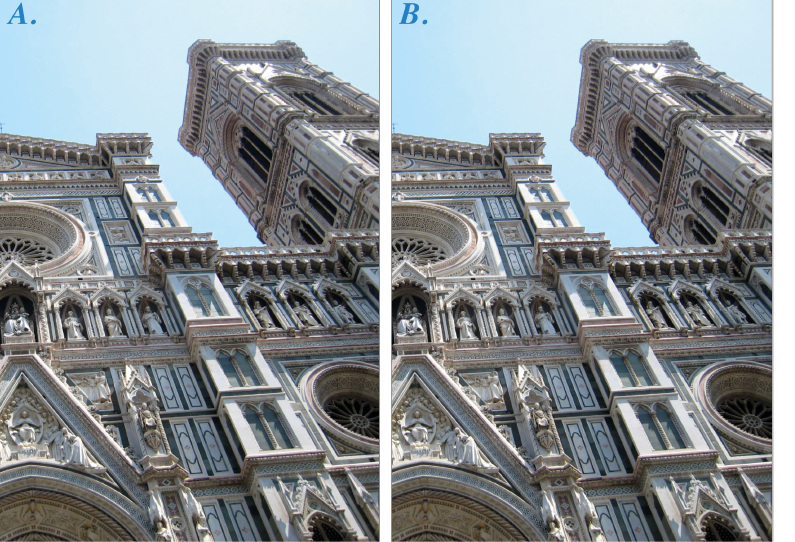 Il Duomo di Firenze in fig. 1.a e la strada in fig. 2.b sembrano avere una maggiore pendenza della loro controparte, sebbene siano perfettamente identiche. Forse vi stupirà sapere che l’angolo dello scatto è identico in ambedue le coppie di foto. Ma allora perché ci sembrano ‘inclinate’ in modo diverso?