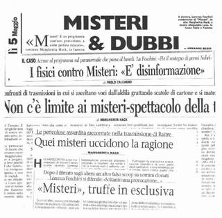 Una prima notazione si impone. Se l'ambizione del programma era quella di far conoscere al grande pubblico fenomeni e capacità sinora ignote, va riconosciuto che il risultato ottenuto è davvero deludente. In tre anni di trasmissioni, infatti, nessuno dei tanti partecipanti è riuscito a produrre alcuna prova dei suoi presunti poteri paranormali. Dei tanti articoli e studi che, secondo i diversi ospiti della Foschini, sarebbero stati presto pubblicati per offrire anche ai più scettici una prova definitiva e certa dell'esistenza di un qualsiasi potere paranormale, non uno è uscito. E anche le molte ricerche annunciate come prossime alla conclusione si devono essere perse per strada, perché non se ne è vista traccia su alcuna rivista scientifica seria. Quel che vi è di certo, dunque, è solo che Misteri è stato un ottimo trampolino pubblicitario per questi signori e per le loro attività. Quel che, ancora una volta, non si è visto è la prova reale di così clamorosi poteri e capacità.Nelle pagine seguenti leggerete alcuni articoli sulla trasmissione pubblicati da diversi quotidiani e riviste. Come vedrete si tratta nella totalità dei casi di giudizi molto duri, ma anche, a nostro parere, estremamente motivati. E' infatti chiaro che i giornalisti e gli scienziati che si sono espressi non lo hanno fatto per snobismo intellettuale, ma per denunciare una reale incapacità della trasmissione di offrire al grande pubblico della televisione un approfondimento serio sul cosiddetto paranormale.