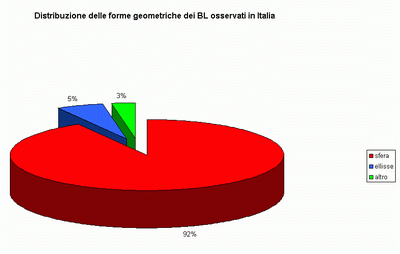 Per il 68% dei casi, i testimoni si trovano a una distanza minima dal BL inferiore ai 5 metri, mentre nel 28% dei casi è inferiore a un metro: le osservazioni avvengono a distanze piuttosto ravvicinate, a causa del fatto che, per lo più, ci si trova in un ambiente domestico. Il 92% dei BL osservati sono descritti come sfere, nel 5% come ellissoidi. In un caso il BL aveva la forma di un cilindro. Le dimensioni vanno da pochi cm ad alcuni metri. Il diametro più comune per le sfere è compreso fra 20 e 50 cm, in accordo con i dati russi che però hanno una distribuzione più omogenea e un picco meno marcato. Di solito le sfere sono colorate, i colori più frequenti sono il bianco e il giallo, ma non mancano rosso, arancio, blu e verde. In un solo caso si è avuto a che fare con un BL multicolore. Il bianco è riportato in circa 1/3 delle testimonianze, il giallo è di poco inferiore. Nel 52% dei casi l'osservazione del BL avviene all'interno di edifici, spesso il BL penetra dentro le abitazioni attraverso porte e finestre (anche chiuse). Seguono le osservazioni di BL in cielo (21%), nei prati (11%) e in strada (13%). Nei dati russi l'osservazione all'interno di edifici è la metà dei casi (come per l'Italia), le altre voci però seguono un ordine di importanza diverso.