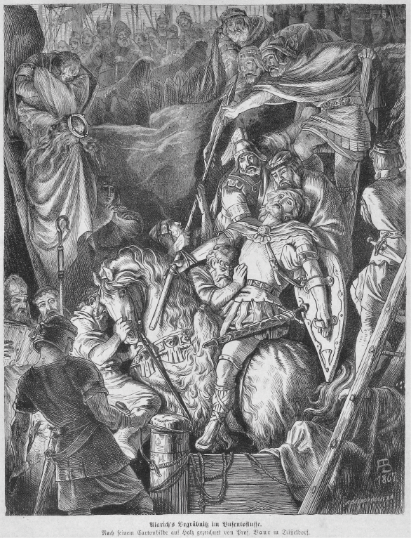Ci sono altri illustri sovrani del passato la cui memoria aleggia ancora nei luoghi che custodirebbero le loro tombe perdute. A Cosenza si cerca quella di Alarico, re dei Visigoti, protagonista del celebre saccheggio di Roma del 410. Perché a Cosenza? Perché dopo quell’epocale evento, questi si diresse alla testa del suo esercito verso il Bruzio (Calabria), intento a raggiungere l’Africa settentrionale. Ma morì improvvisamente, e anche abbastanza misteriosamente, nell’estate dello stesso anno proprio vicino alla città calabra. A questo punto la storia si mescola alla leggenda, in quanto l’unica fonte che ne parla è la Getica dello storico bizantino Jordanes, più tarda di quasi un secolo e mezzo rispetto agli eventi e ritenuta poco attendibile da molti storici: Alarico sarebbe stato sepolto nei pressi di Cosenza, nel letto del fiume Busento, deviato temporaneamente per quell’occasione. Tutti gli operai coinvolti nell’opera sarebbero stati uccisi e sepolti insieme al re e alle enormi ricchezze accumulate nelle sue razzie.