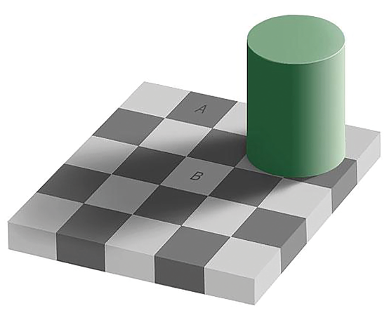 Per illustrare la difficoltà del grado di fiducia da dare alle testimonianze, si può utilizzare una celebre illusione ottica, la scacchiera di Adelson (si veda la figura in alto). Supponiamo che, chiamati a testimoniare di fronte alla corte, Tizio e Sempronio abbiano giurato di non aver mai visto prima la figura e che debbano descrivere i colori delle caselle che nell’immagine sono marcate con le lettere A e B. Come deve comportarsi il giudice se Tizio afferma che la casella A è più scura della casella B, mentre Sempronio afferma che entrambe le caselle sono dello stesso colore?