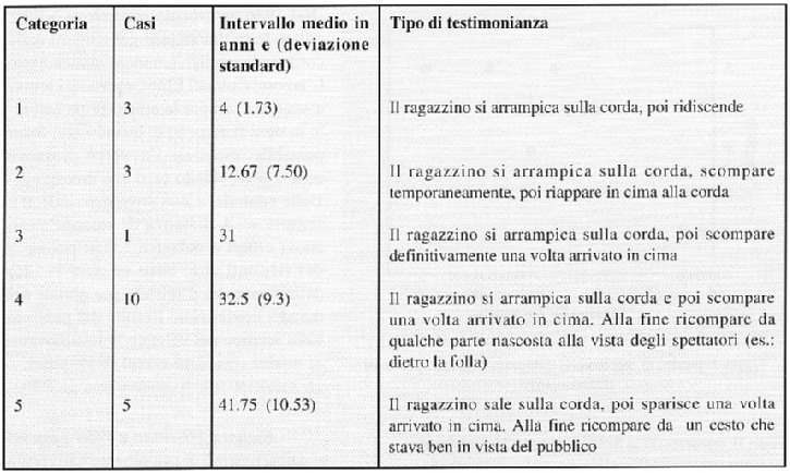 Per verificare questa ipotesi abbiamo raccolto ogni genere di libri, saggi, articoli di giornali e riviste che parlassero della corda indiana, riuscendo a trovare 48 testimonianze oculari. Di queste furono scartate: le testimonianze indirette (che erano in tutto 3), le testimonianze in cui non era riportato l'anno dell'accaduto (13), quelle che non contenevano alcuna descrizione dell'accaduto (6) o che riportavano dettagli insufficienti per la ricostruzione (soggettiva) delle sequenze del numero (5). Rimasero 21 versioni dirette, sufficientemente dettagliate e comprensive dei dovuti riferimenti temporali, che furono poi suddivise in cinque categorie ordinate per grado di sensazionalità. Quest'ordine venne stabilito indipendentemente da una commissione composta da prestigiatori.